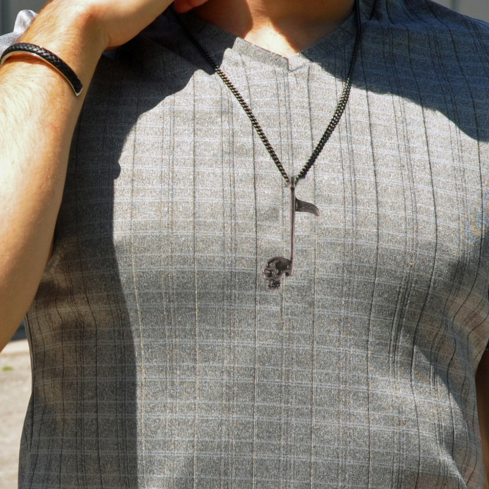 Tomahawks are multi-purpose weapons, commonly employed in combats. Our Tomahawk features a vintage skull pendant streamlining into an axe, creating an unforgettable piece of accessory, quite close to the real thing.