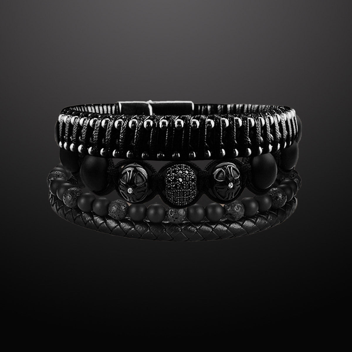 Crafted for the modern warrior, this all-black stack channels quiet power and focused intent. Featuring a bold mix of braided leather, matte onyx beads, and engraved accents, it’s a reflection of resilience, purpose, and refined edge. Wear it as your everyday armor, strong, centered, unmistakably you.
