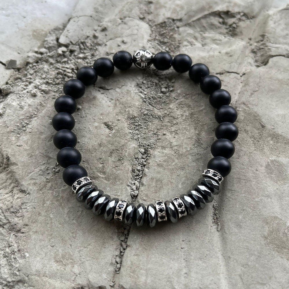 Apollo is an elegant beaded bracelet showcasing 6mm Black Agate and Pyrite gemstone beads with sparkling CZ and Trident Symbol beads. With it's comfort stretch fit, Apollo is perfect to rock solo or layered with other bracelets for cool, casual vibes.