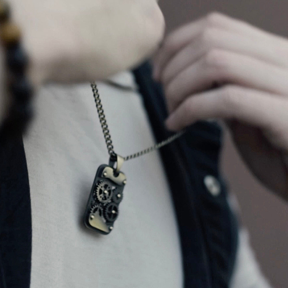 Introducing the Wheel of Time Amulet Necklace. Crafted with precision, this modern amulet features two moving wheels in a precision, modern aesthetic. The two tone bronze finish makes this necklace perfect for any occasion, adding a touch of personality to your attire.
