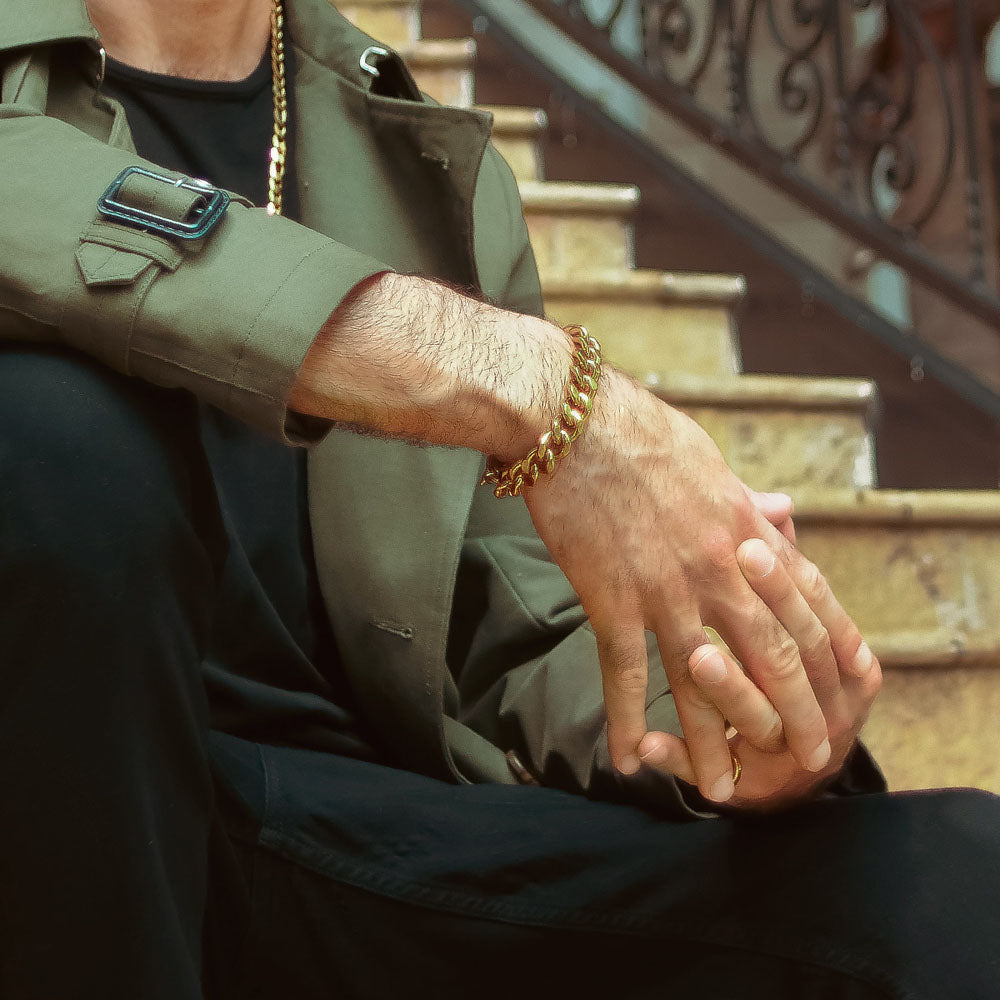 Add a touch of subtle strength to your look with our men’s 12mm Curb Link Chain Bracelet in gold. A high polished finish lends a premium look to this popular bracelet with a modern fit and style. PVD coating has long been favored for a durable and scratch-resistant accessory that withstands all the elements of an active lifestyle without sacrificing a luxurious look.