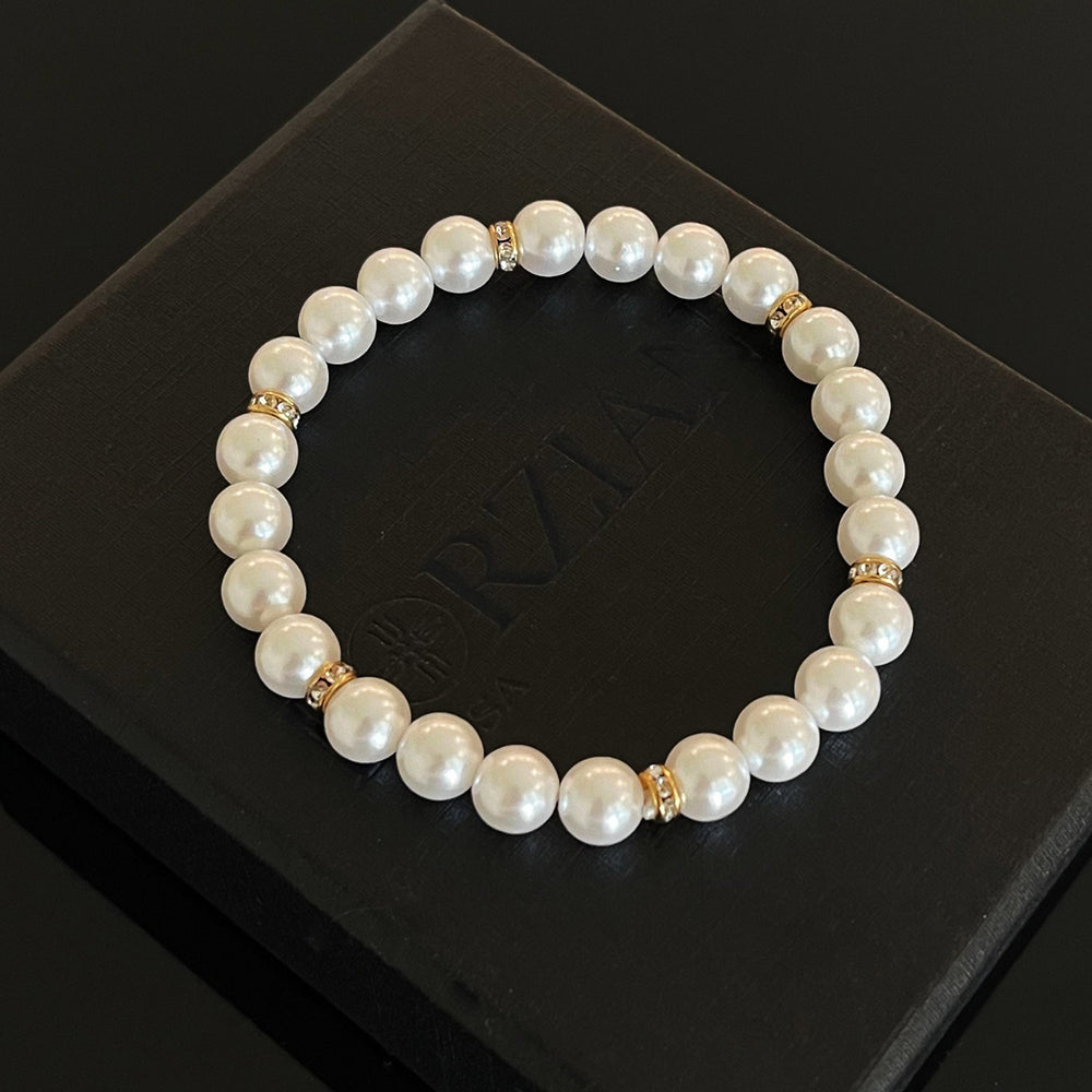 In a world saturated with mediocrity, nothing can rival the authenticity of traditional luxury. This subtly opulent bracelet showcases genuine white freshwater pearls, elegantly interspersed with lab diamond studded rondelles in gold. Hand-strung with care in our Orlando studio, this stretch bracelet adjusts over the wrist for easy transitions and offers versatile styling options with a comfortable wear.