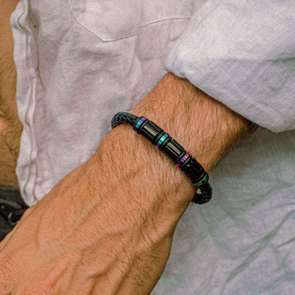 Handcrafted from premium materials this modern bracelet is handcrafted in black woven leather with vibrant titanium accents. With a magnetized clasp in black rhodium, it stacks effortlessly with other bracelets and watches, but is substantial enough to hold its own.