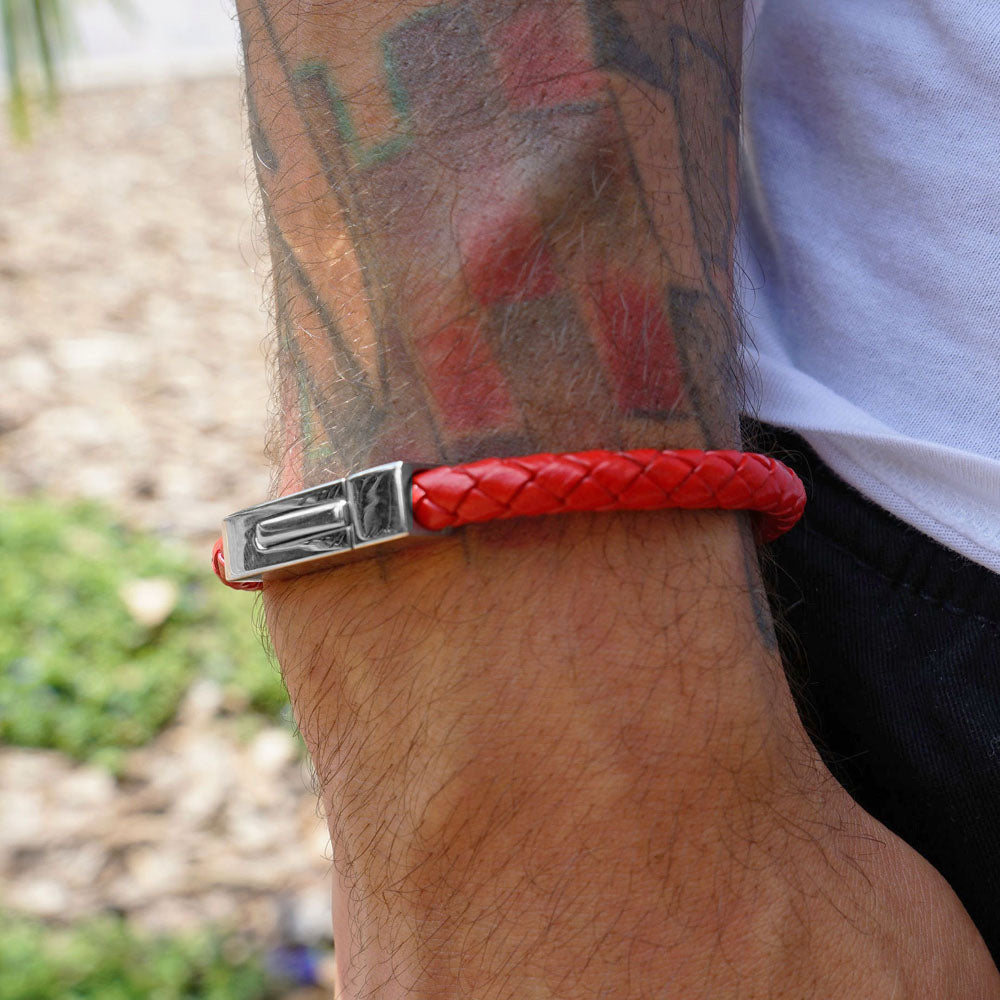 Handcrafted and braided in luxurious deep red leather Leo is an elegant classic. Wear this minimalistic bracelet alone or pair it with your watch for a stylish option to any outfit.