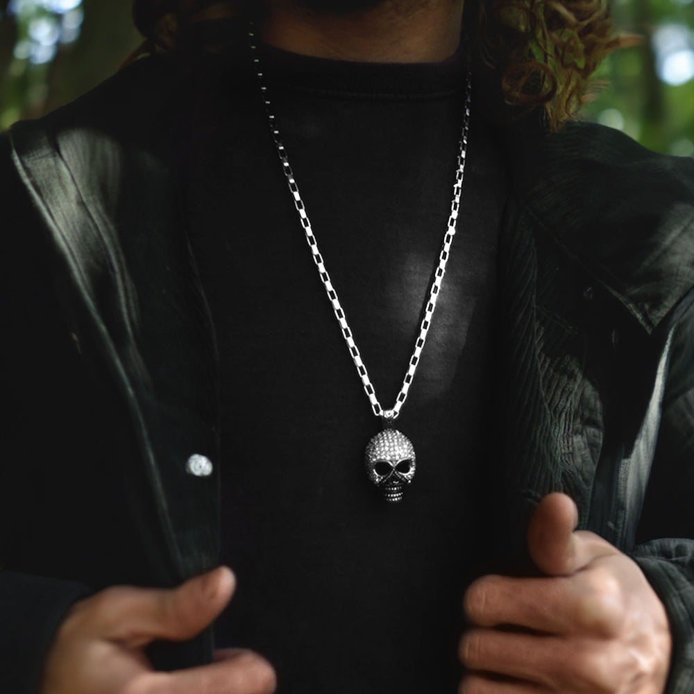 Sparkling White CZ Diamonds lend shimmering brilliance to this captivating amulet in a linked chain, in rhodium coated stainless steel. Each stone is meticulously matched for color and set by hand in this show stopper of a necklace. Skull is a transient symbol signifying freedom mindset and transition into power with inner strength.
